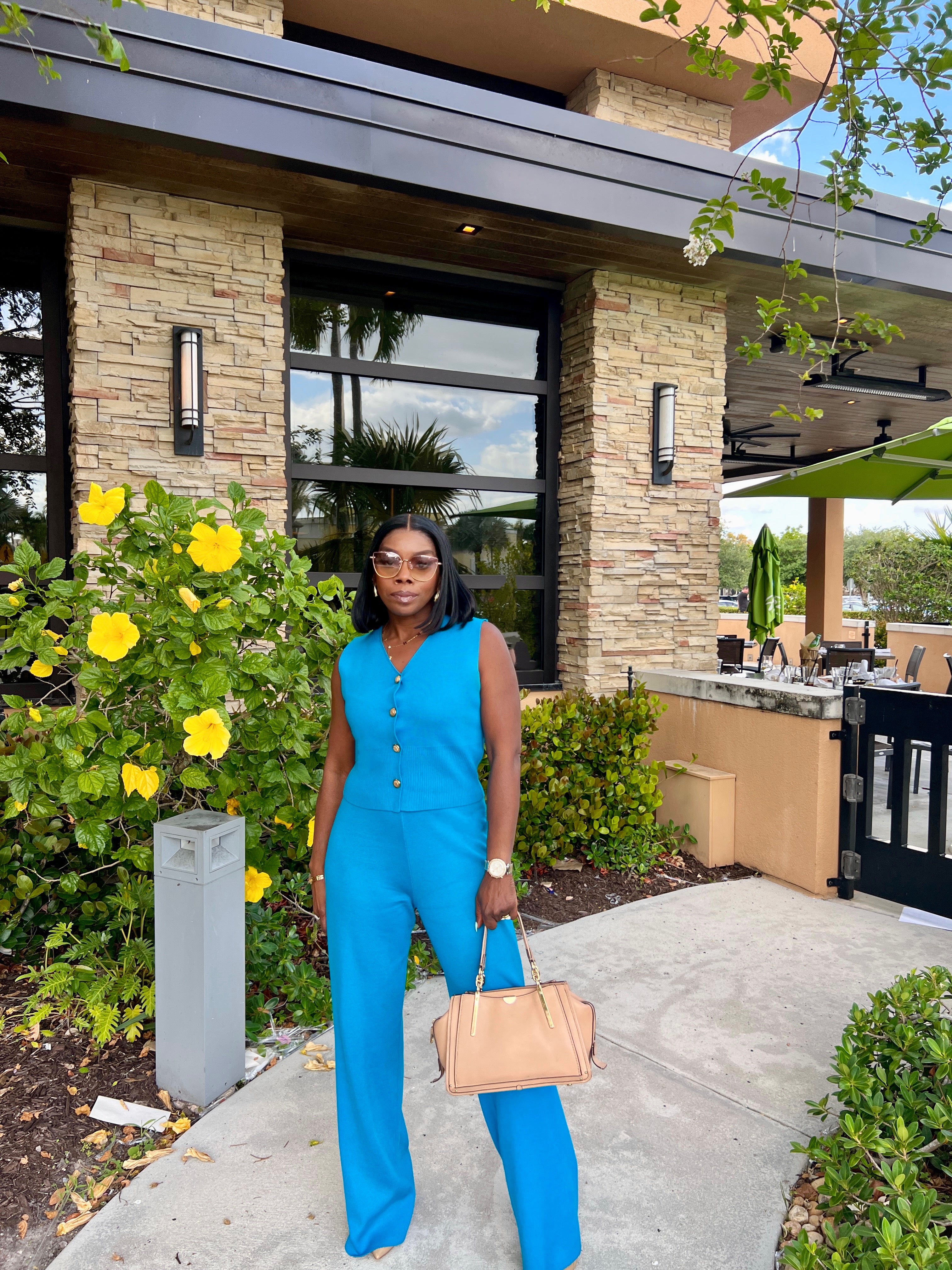 Upgrade your wardrobe with this bold turquoise two-piece set. The set includes a sleeveless V-neck top detailed with stylish gold buttons and high-waisted, wide-leg pants designed for a flattering, elongated silhouette. Crafted from a soft, stretch knit fabric, this outfit offers both style and all-day comfort. Perfect for brunch, vacations, casual business meetings, and spring/summer events. Pair it with nude heels and a neutral handbag for a sophisticated finish.