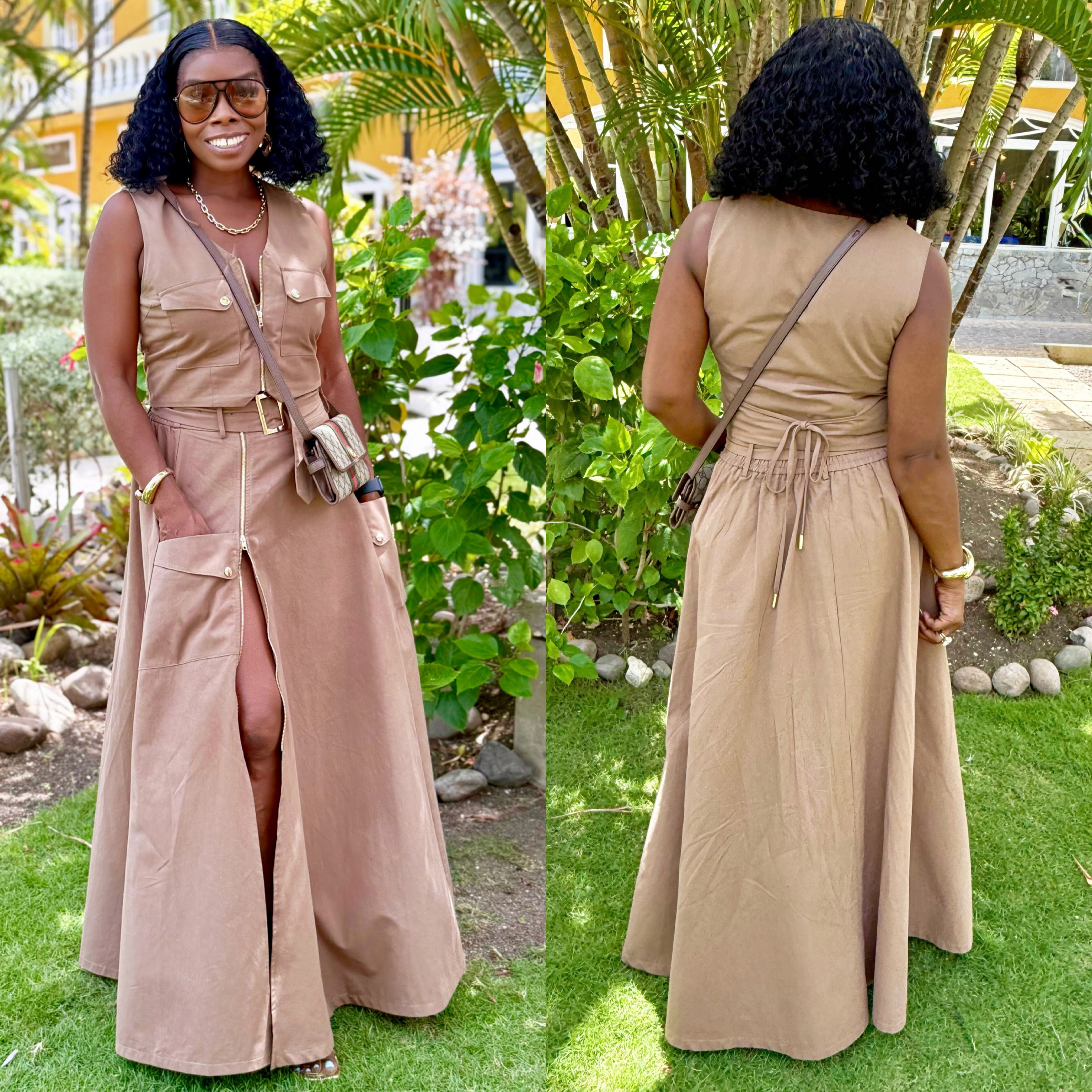 Elevate your everyday style with our Solera Desert Luxe Skirt Set — where casual meets chic. This two-piece set features a sleeveless utility-inspired top with flap pockets, a front zipper, and gold-tone accents that add a polished finish. The matching high-waisted maxi skirt brings all the drama with a flattering A-line silhouette, a subtle front slit for ease of movement, and an adjustable drawstring back for the perfect fit. Crafted in a soft, sand-tone fabric, this set is ideal for warm-weather outings, tropical getaways, or effortless weekend glam.