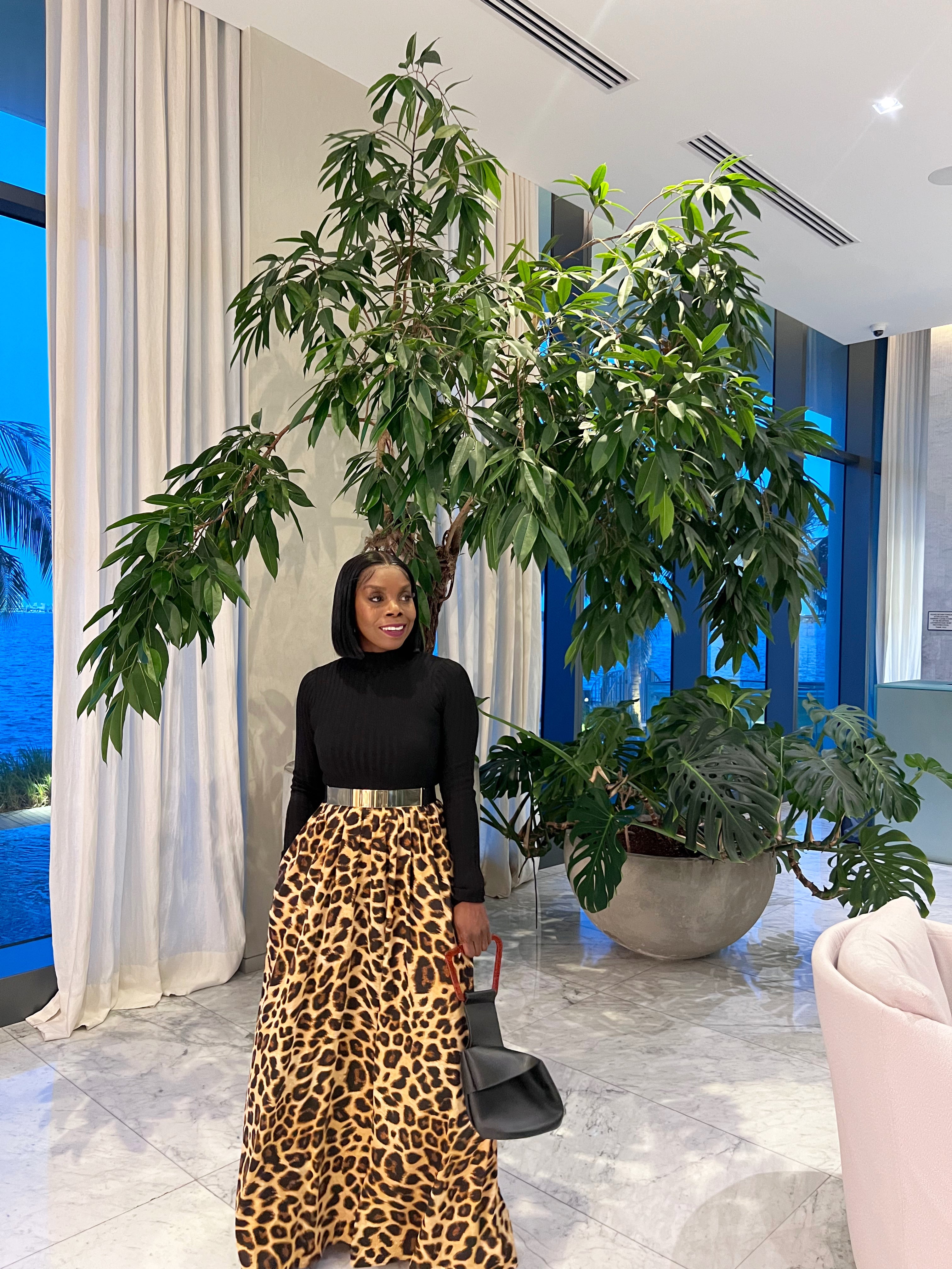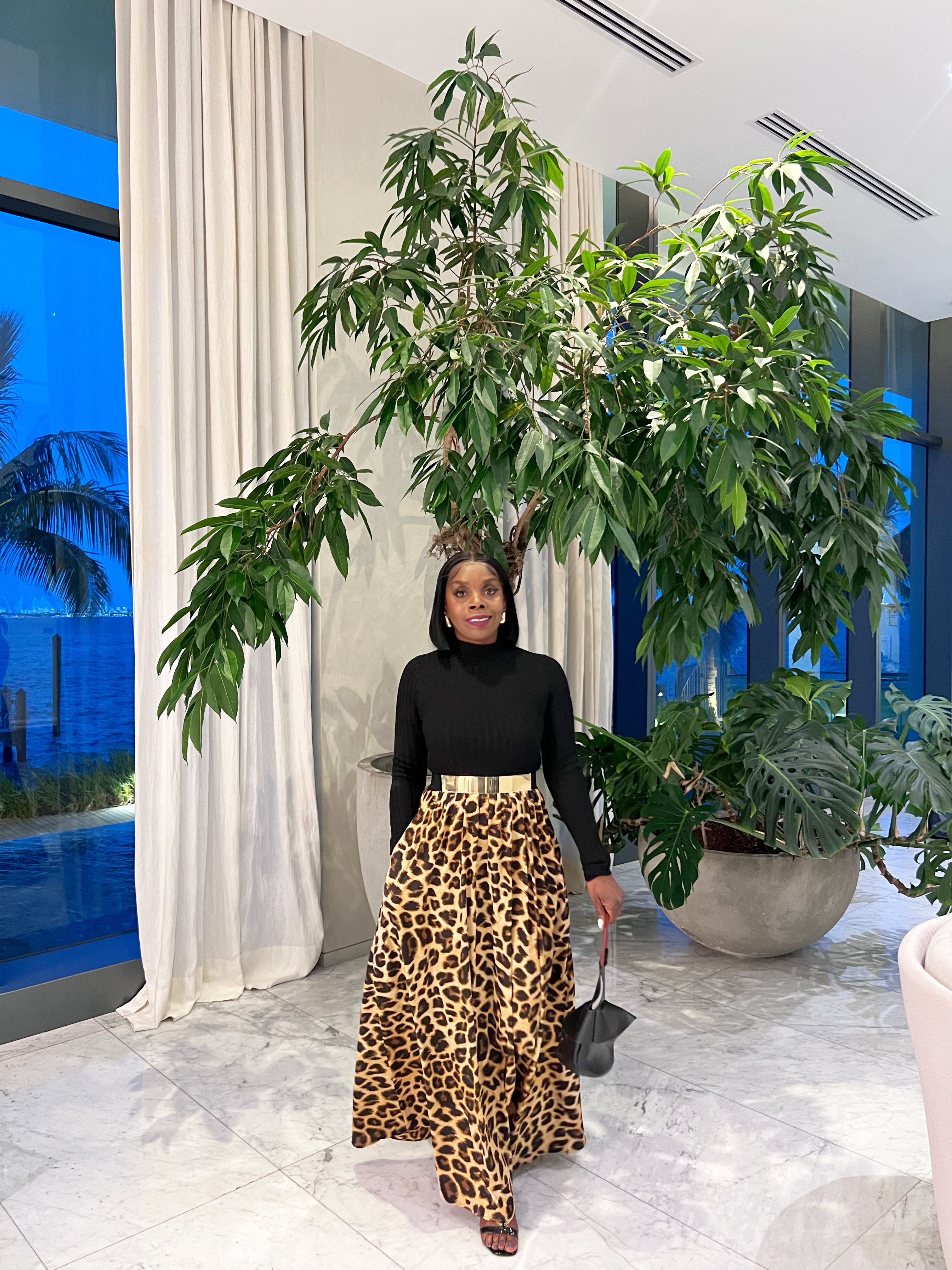 This dress speaks bold and elegance! The beautiful ensemble is composed of two distinct parts. The top is a fitted black long-sleeve, likely made of a ribbed or knit material that gives it a sleek and streamlined look. This fitted top contrasts beautifully with the dramatic, voluminous leopard-print skirt. The skirt features pockets and a full, A-line silhouette that flares outward, creating a striking, attention-grabbing presence. It has deep pockets, which adds both function and style.