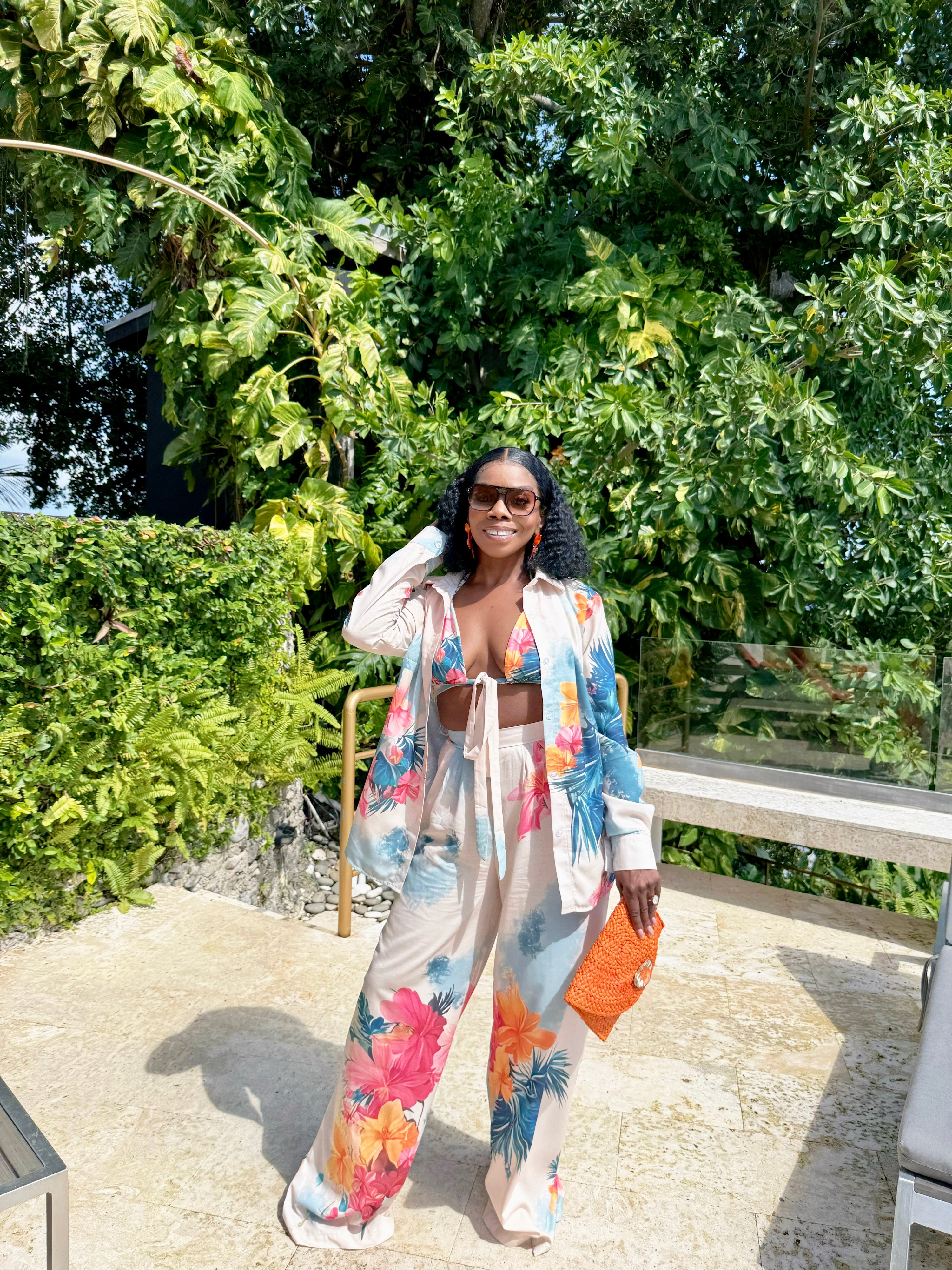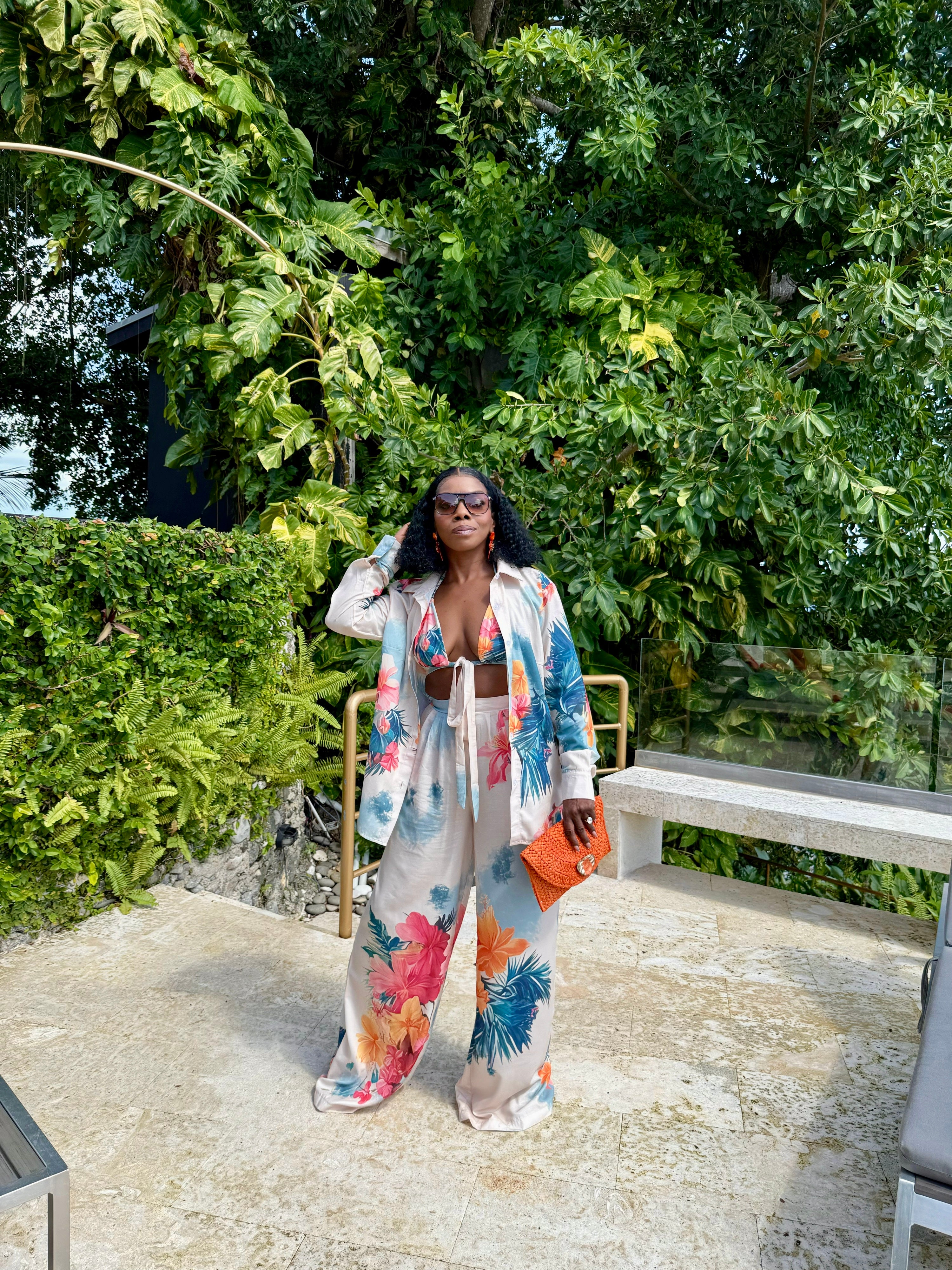 Turn up the heat in our Tropical Breeze 3-Piece Set — the ultimate vacation-ready look. This stunning set includes a vibrant floral tie-front bikini-style top, flowy high-waisted wide-leg pants, and a matching button-down shirt. The lightweight, breathable fabric keeps you cool while the bold tropical print ensures all eyes are on you.