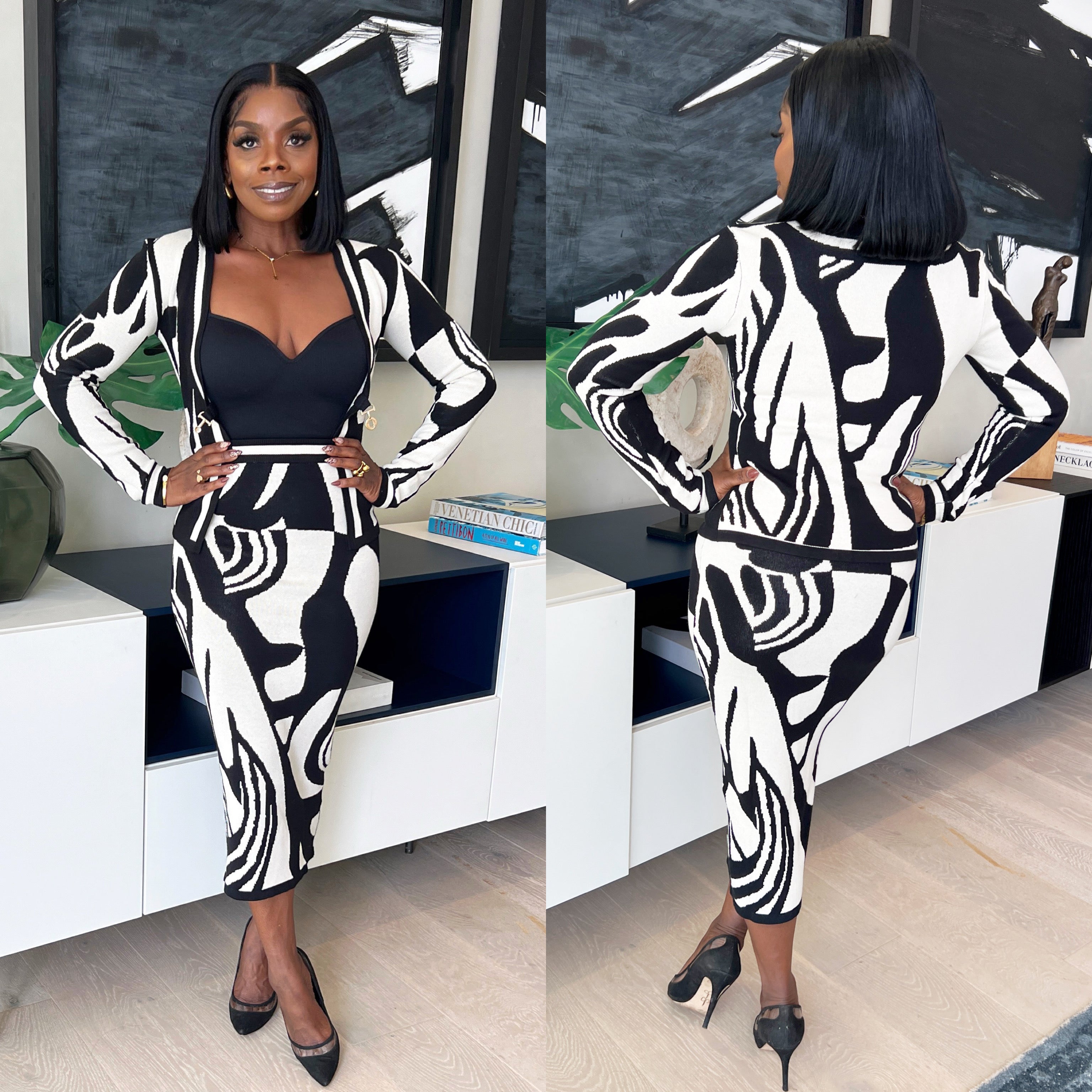 Two piece striking black-and-white patterned two-piece set. The top is a fitted cardigan-style jacket with long sleeves, worn open over a solid black bustier-style top, giving the look a bold contrast. The matching pencil skirt, which falls below the knee, hugs the figure and showcases the same abstract black-and-white print, creating a cohesive, eye-catching design. The overall vibe is sophisticated and polished, especially when paired with black stiletto heels, making it perfect for a professional or upscale setting.