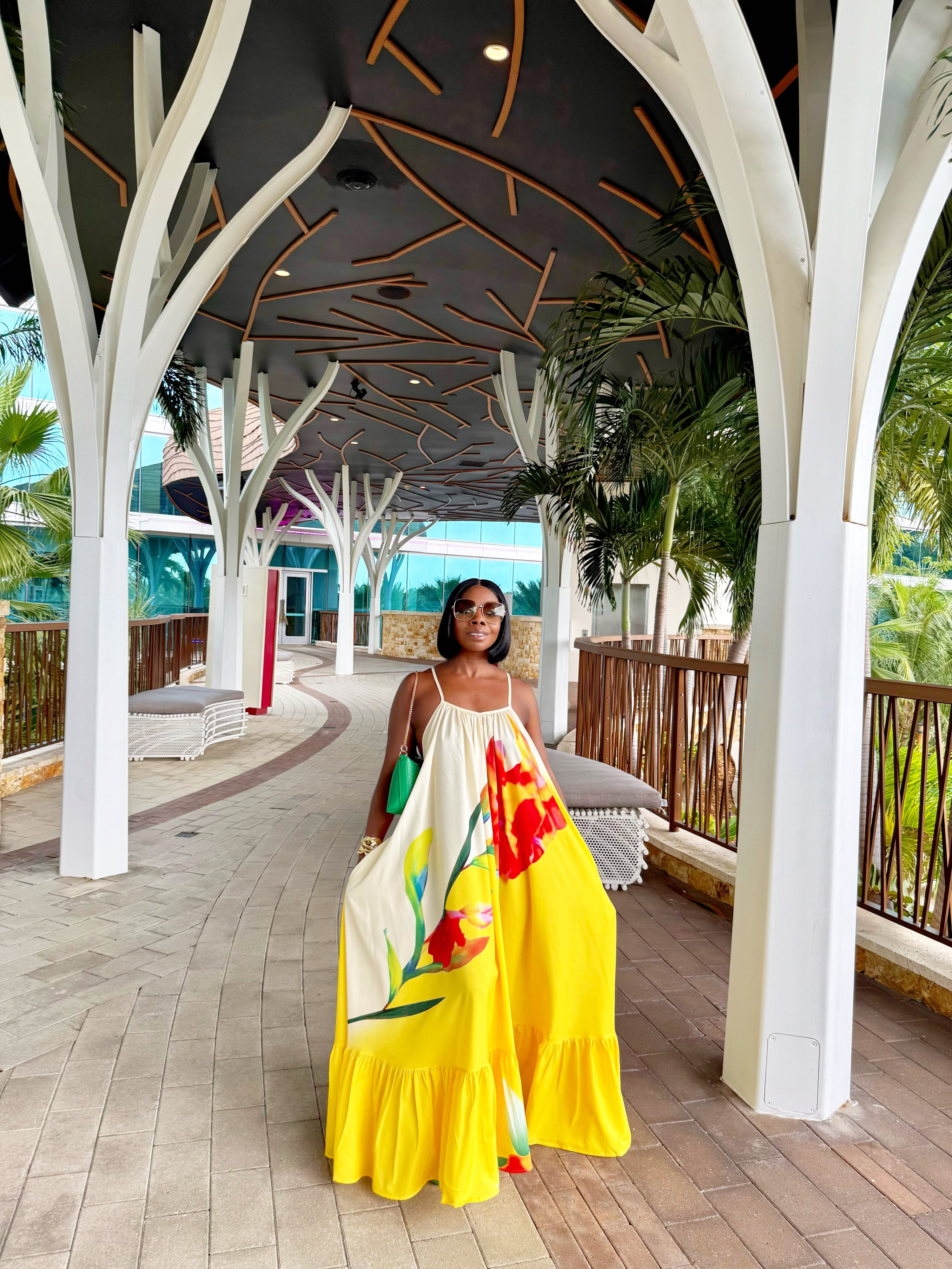 Step into sunshine with the Yara Maxi Dress, a stunning showstopper perfect for vacations, beach getaways, and summer outings. This vibrant yellow and cream maxi features bold red and green floral prints for a tropical vibe that radiates confidence and charm. The lightweight fabric drapes effortlessly, while adjustable spaghetti straps and a flattering tie-back detail offer a perfect fit. With side pockets and a tiered ruffle hem, this backless floral dress combines functionality and feminine flair—ideal for brunch, resort stays, or a beach photoshoot.
