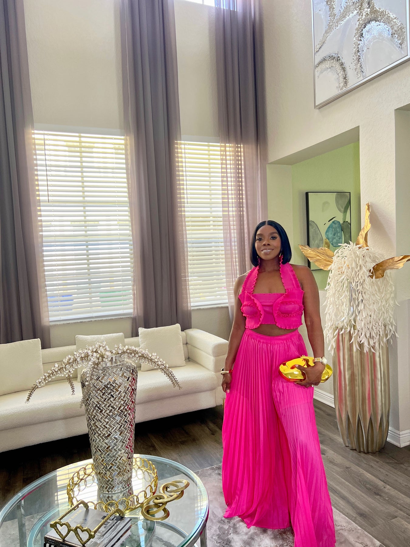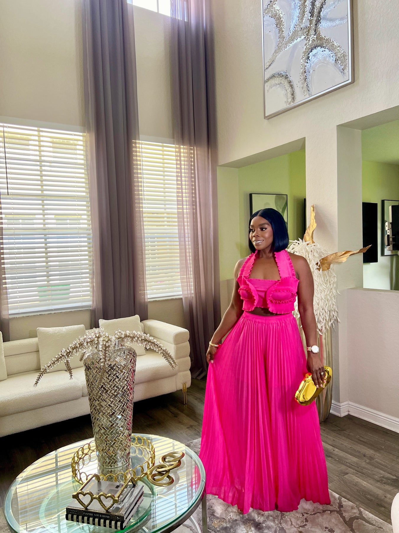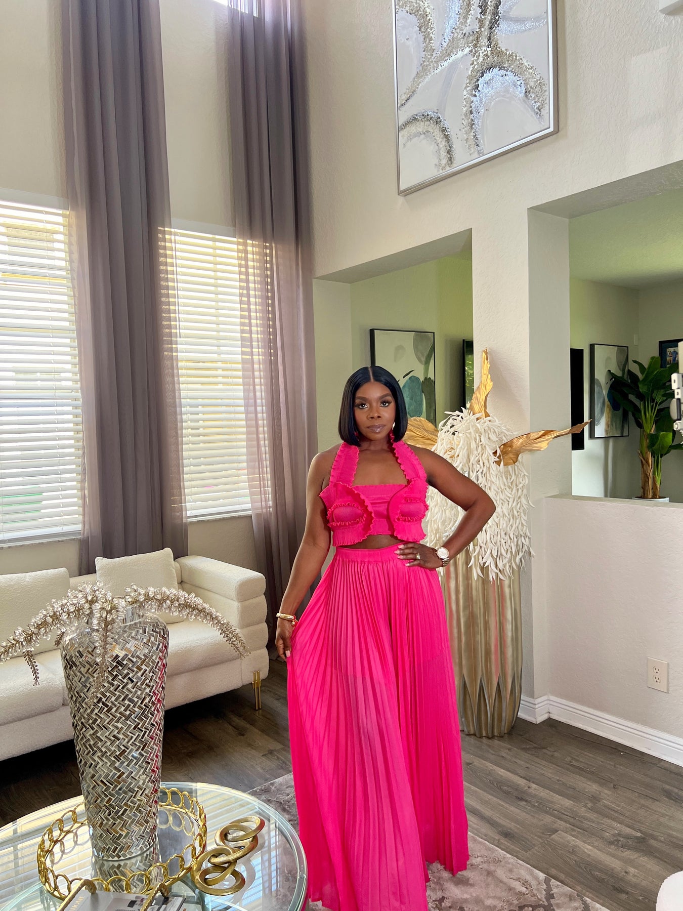Crafted from lightweight, breathable fabric, this bold fuchsia set combines comfort with high-fashion flair. Whether you’re dressing up for a tropical getaway or a girls’ night out, the Rhea set is your go-to for effortless glam.