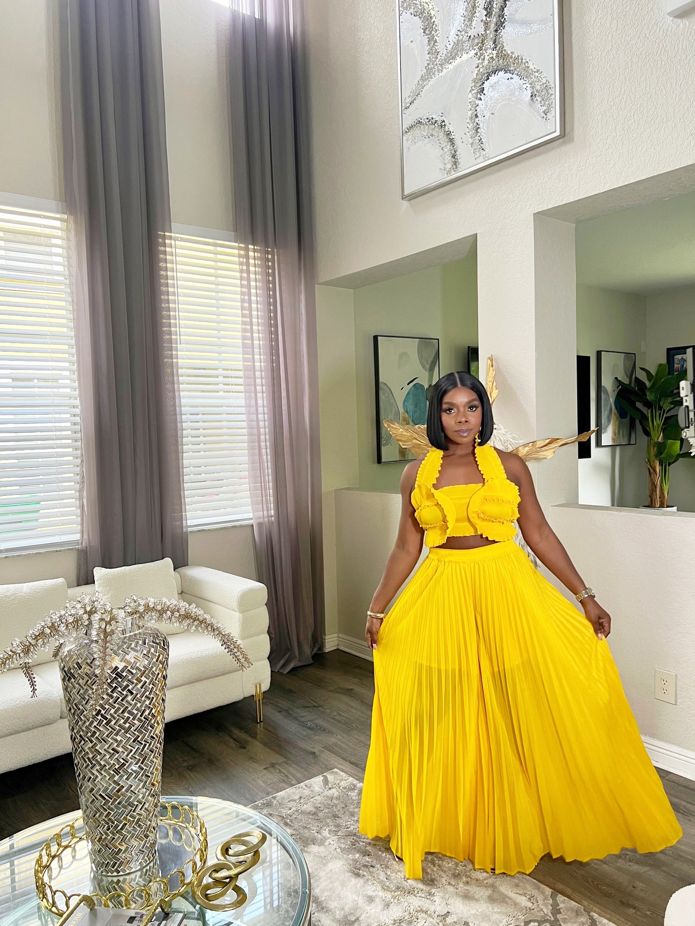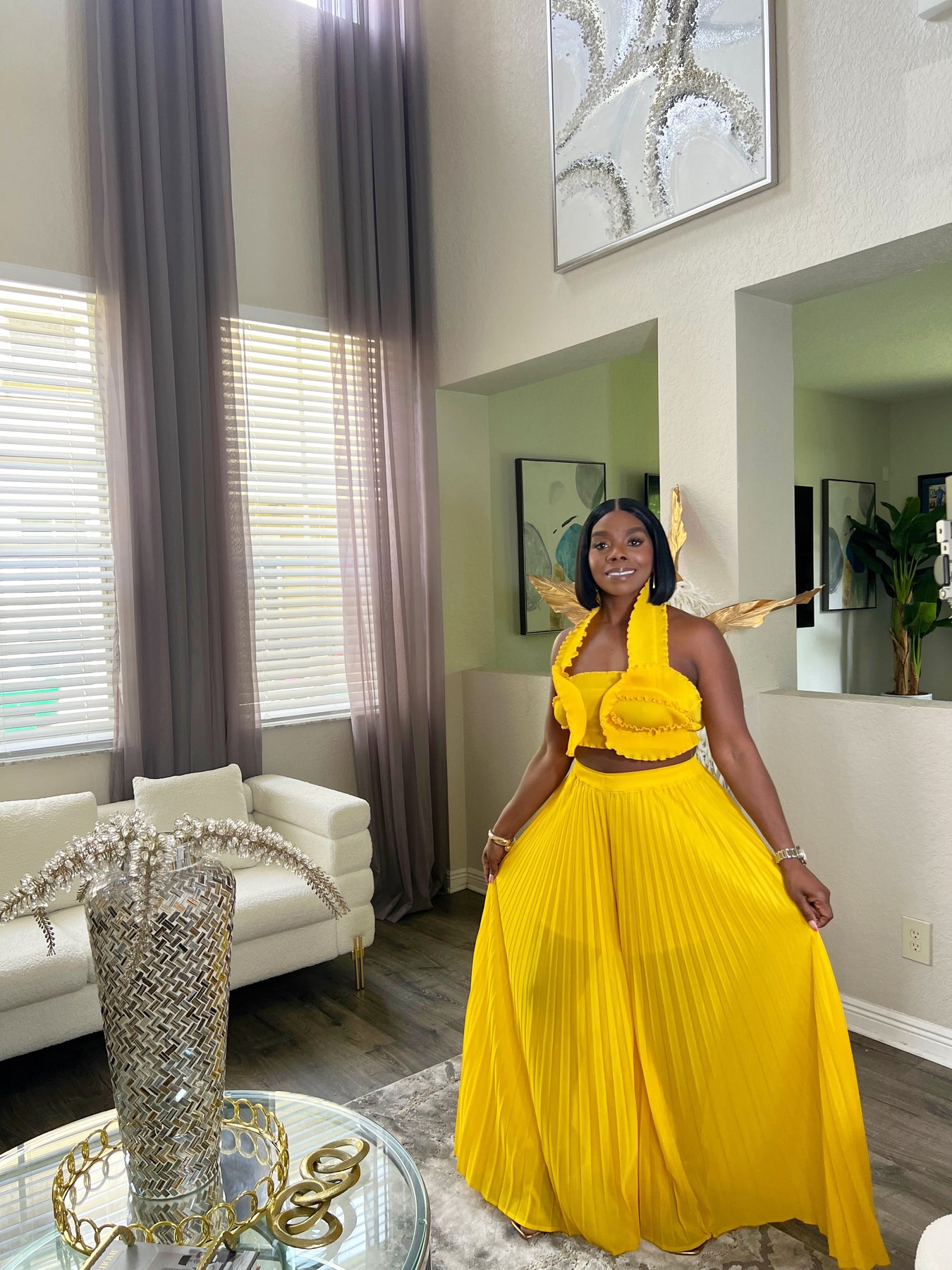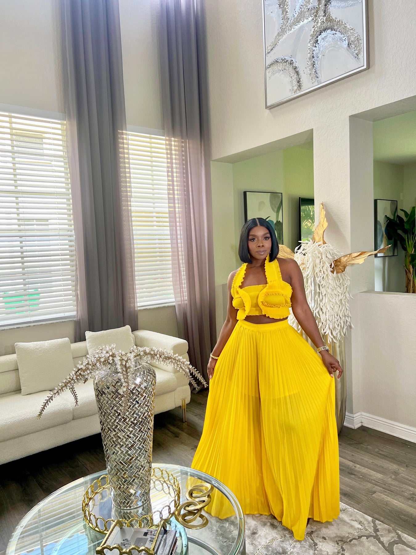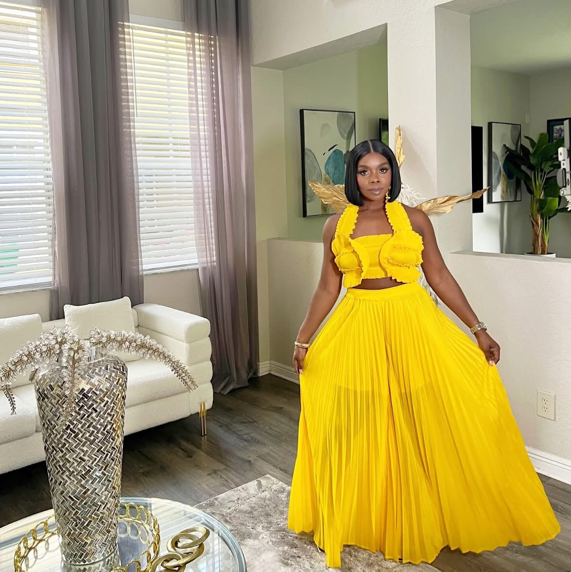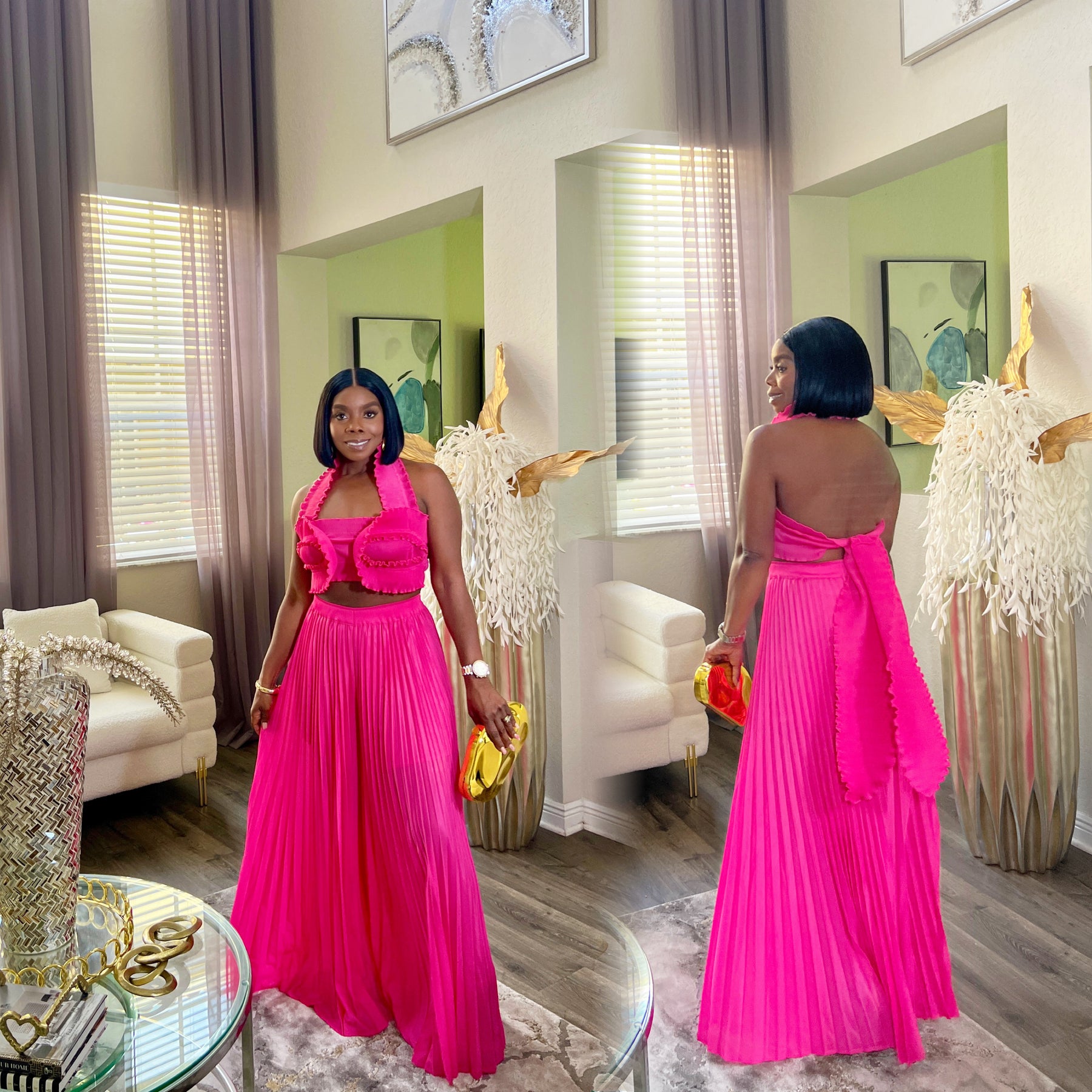 Turn heads in our ZenayaPleated Two-Piece Set, a vibrant and stylish outfit perfect for summer vacations, brunch dates, or any occasion where you want to stand out. This women’s matching set features a flirty halter crop top with ruffle trim and a statement bow-tie back. The high-waisted pleated wide-leg pants create a flattering and flowy silhouette, making it both comfortable and chic.